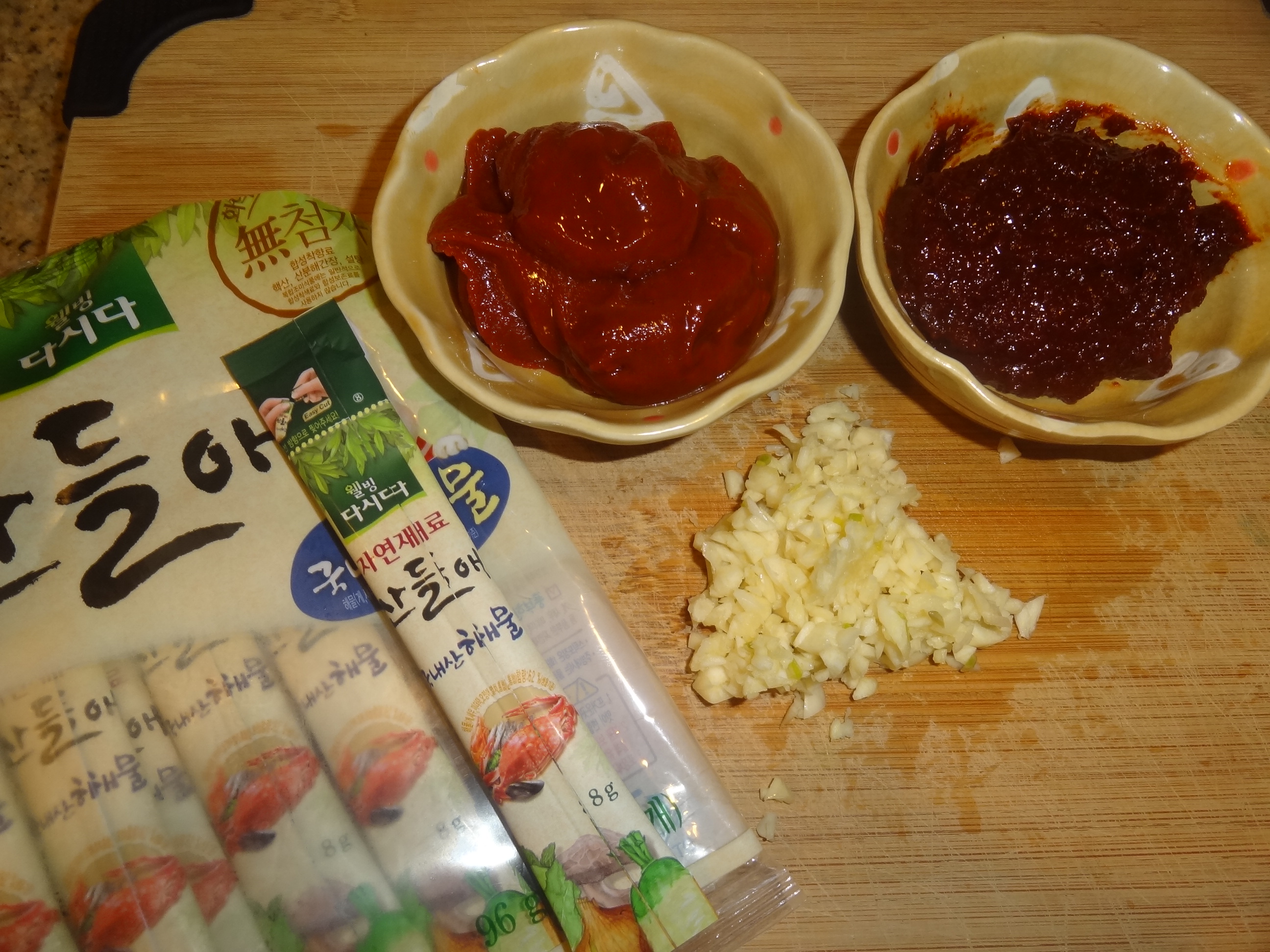 Slice the onion and chop the garlic and put in a pot with boiling water. Add the Gochujang Sauce and keep stirring until the sauce dissolves. Make sure it doesn’t stick to bottom of the pot and burn. Add Salt to taste