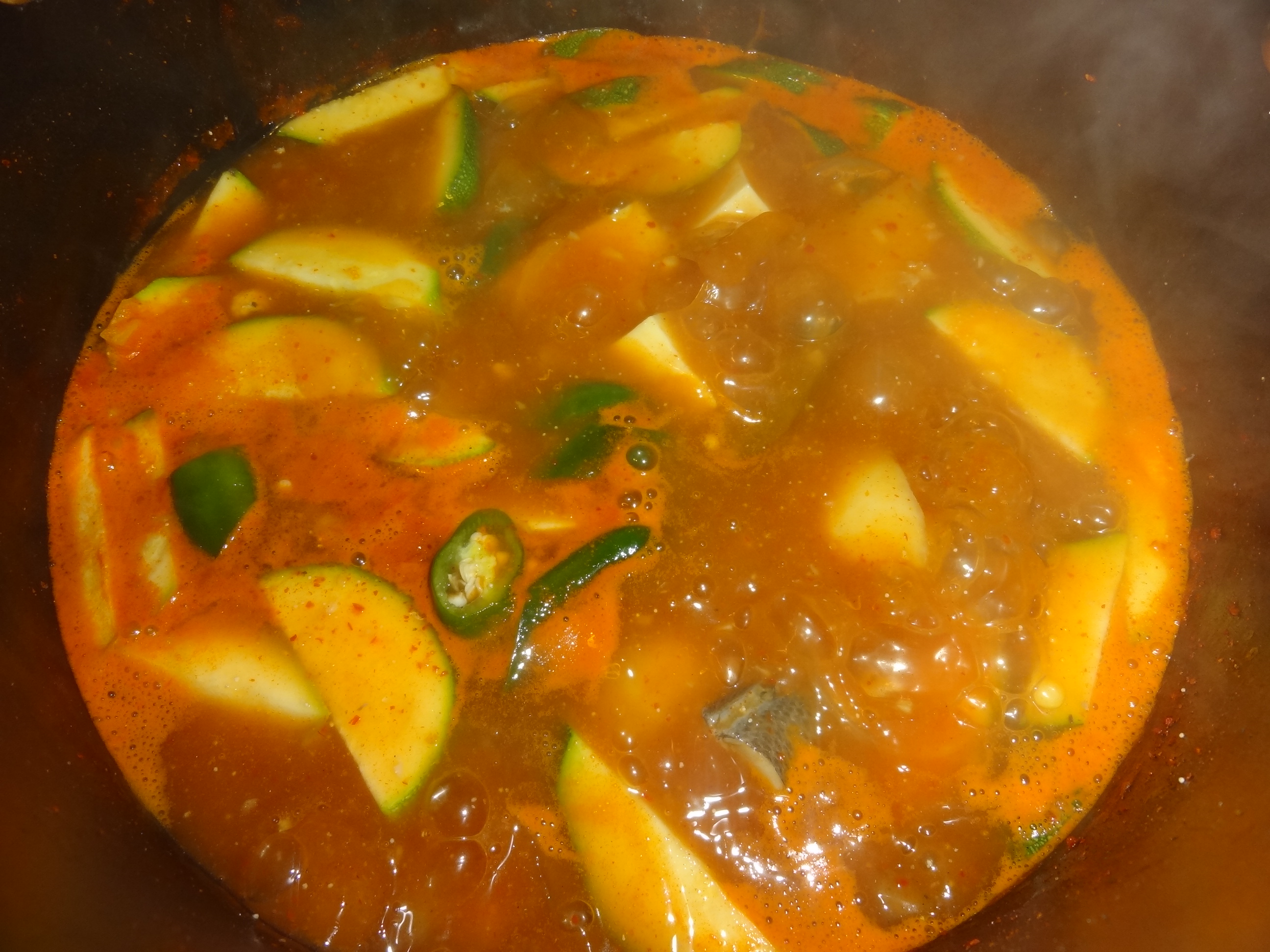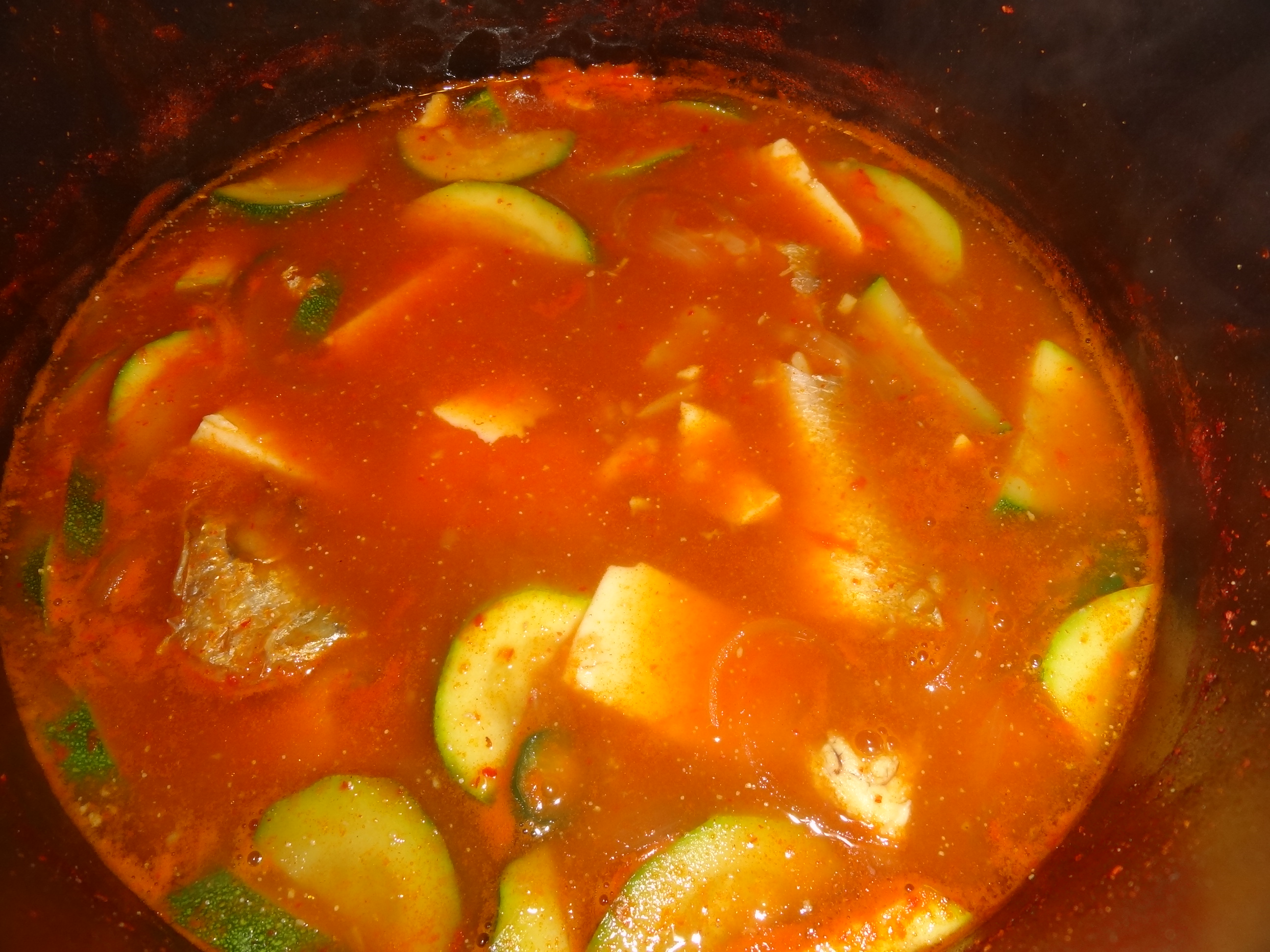 Add the Fish to the boiling broth. This is obviously not a good meal for those who are squirmish around fish eyes and bones. You can make this with fileted fish, however, this is the authentic way you would have it served to you in any traditional Korean restaurant or home.