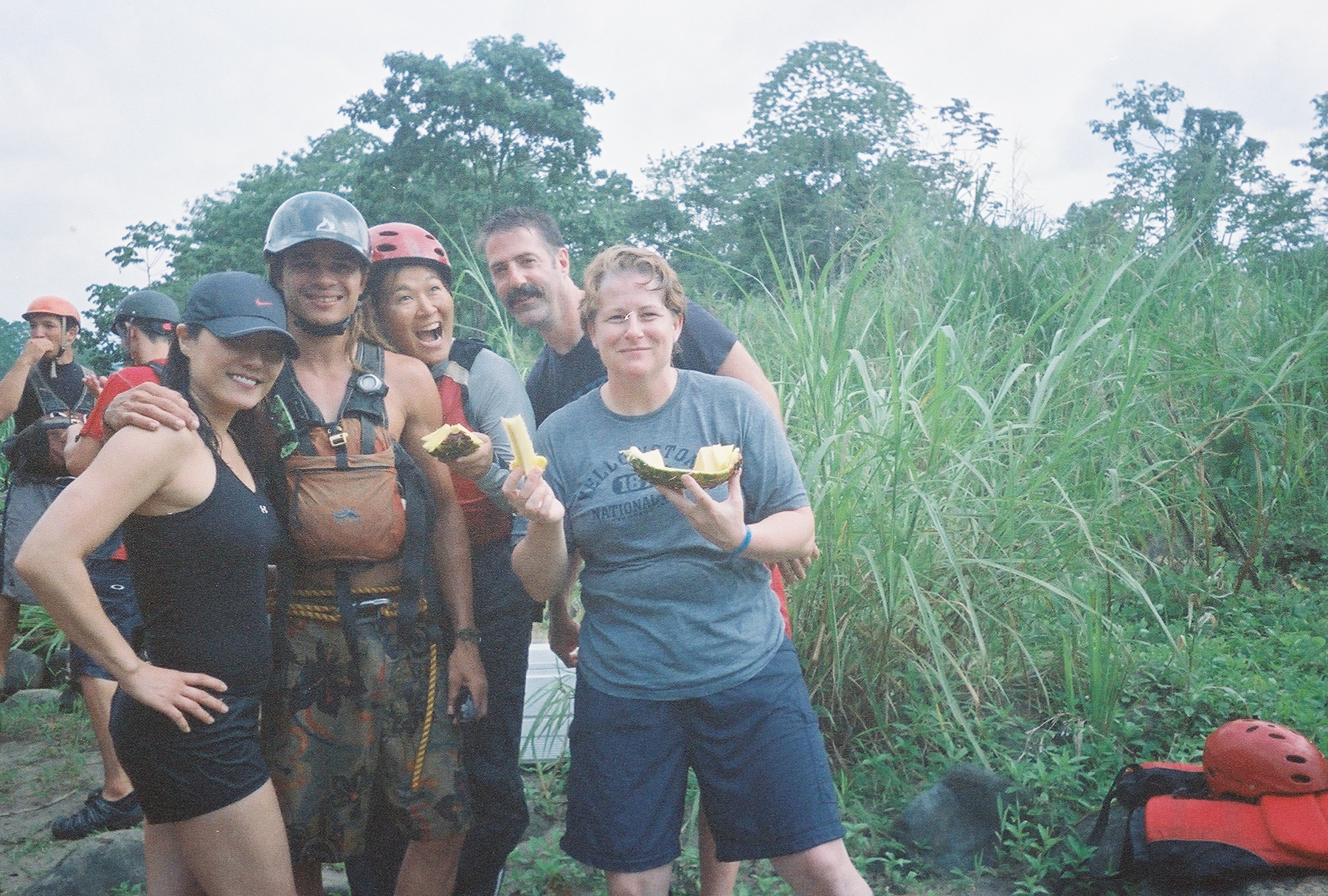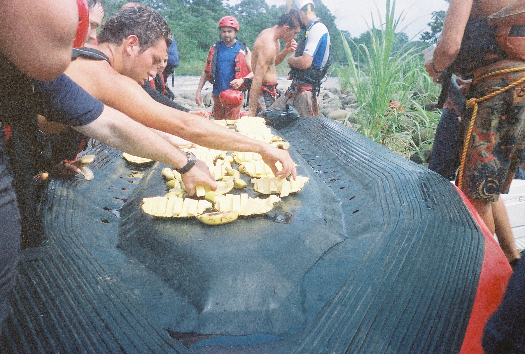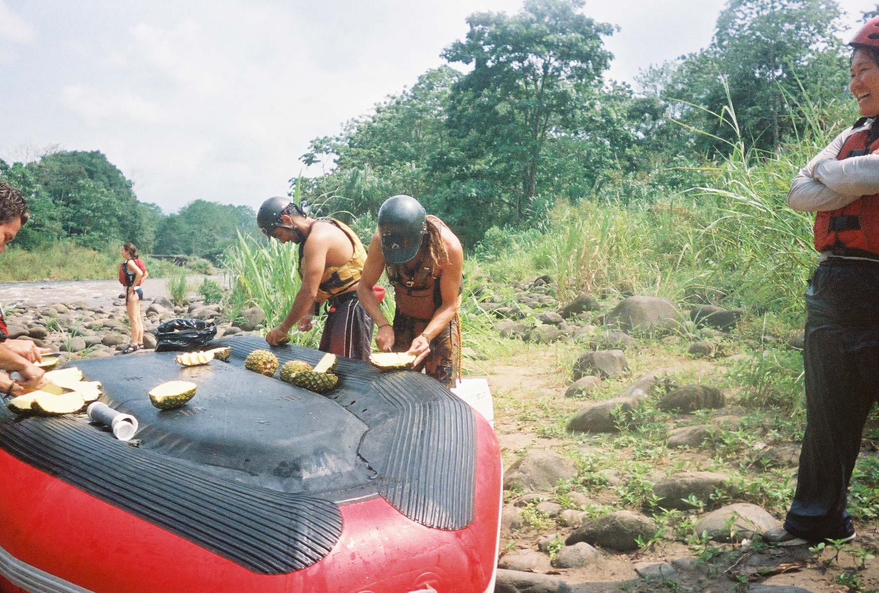 Now it’s time for a break and we all get off and the rafts are flipped upside down to create a cutting board for fresh Pineapple chopped up by none other than our heroic guides! All so young and fit!