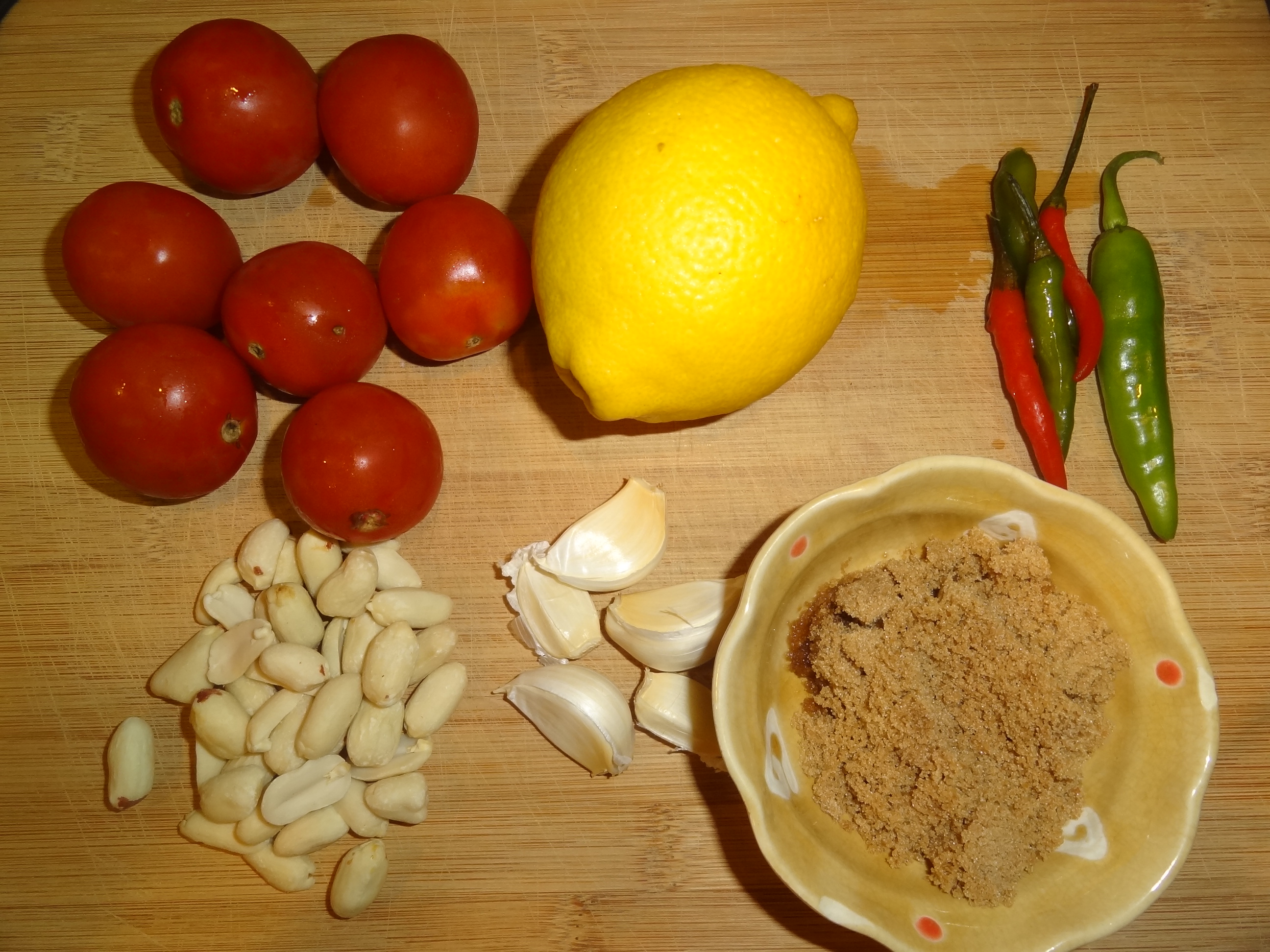 Mince the garlic and chili peppers and add it to all the other ingredients in a bowl for the dressing. Chop the tomatoes and add it to the Green Papaya in a large bowl and toss with the dressing.