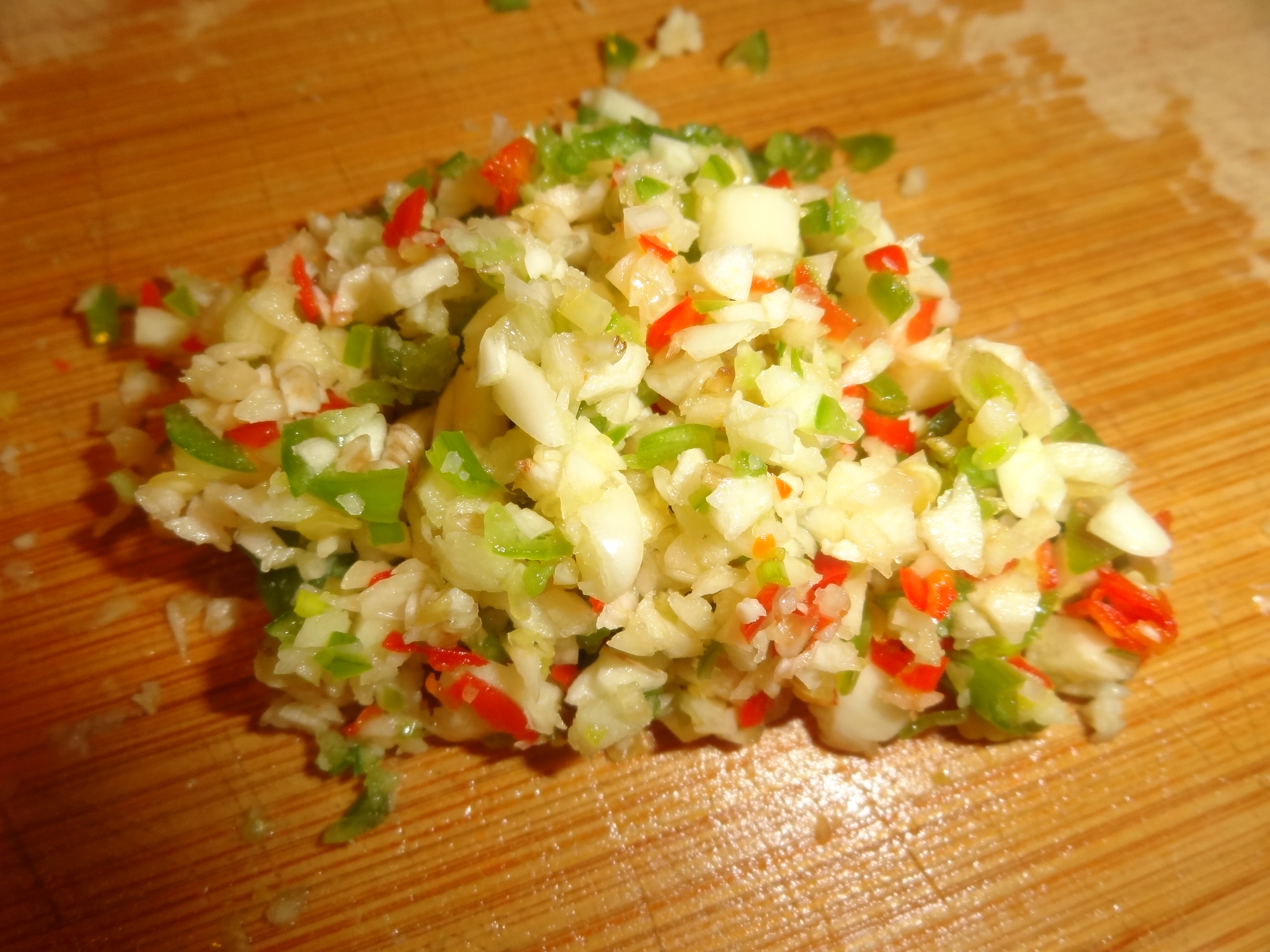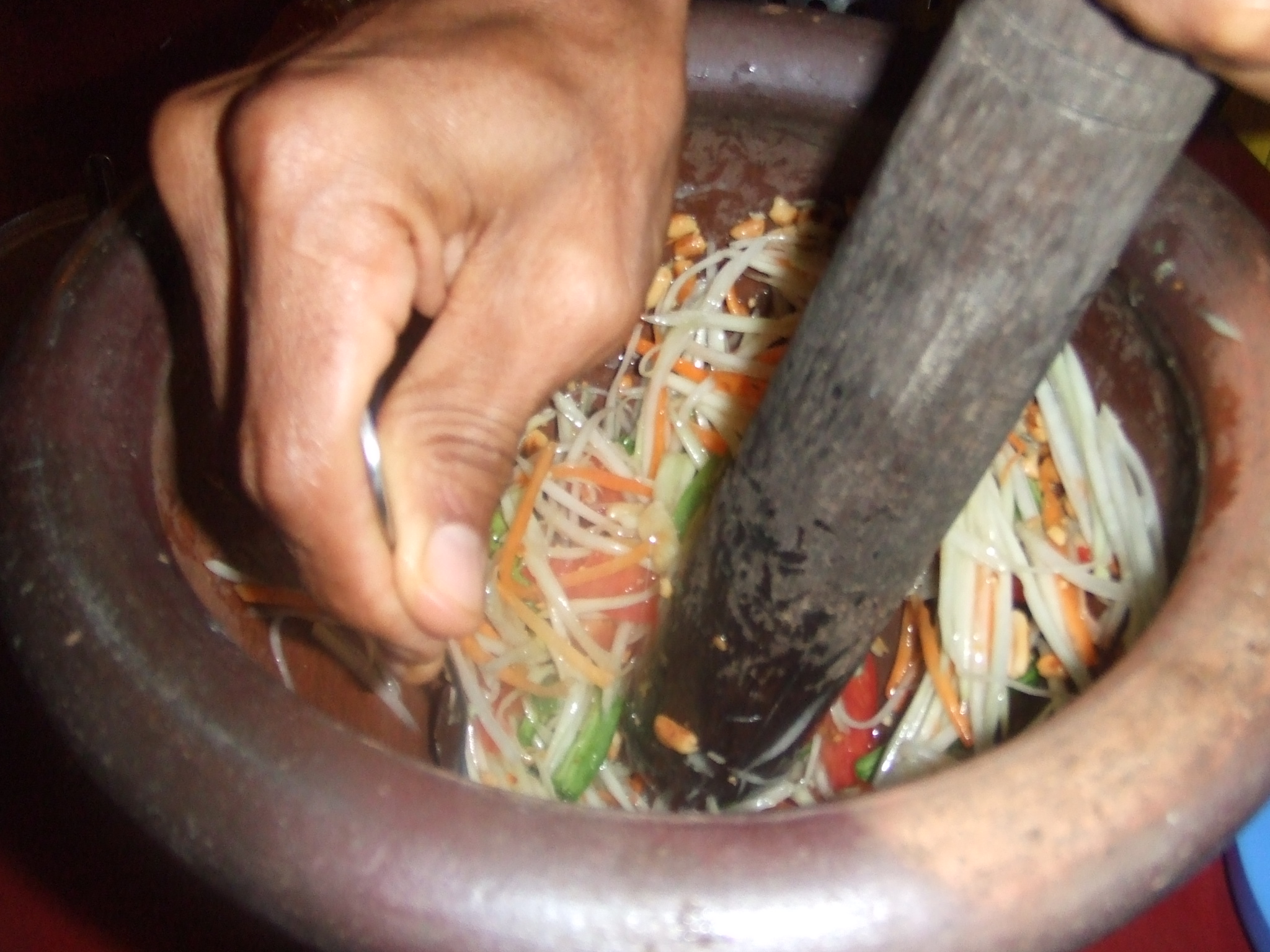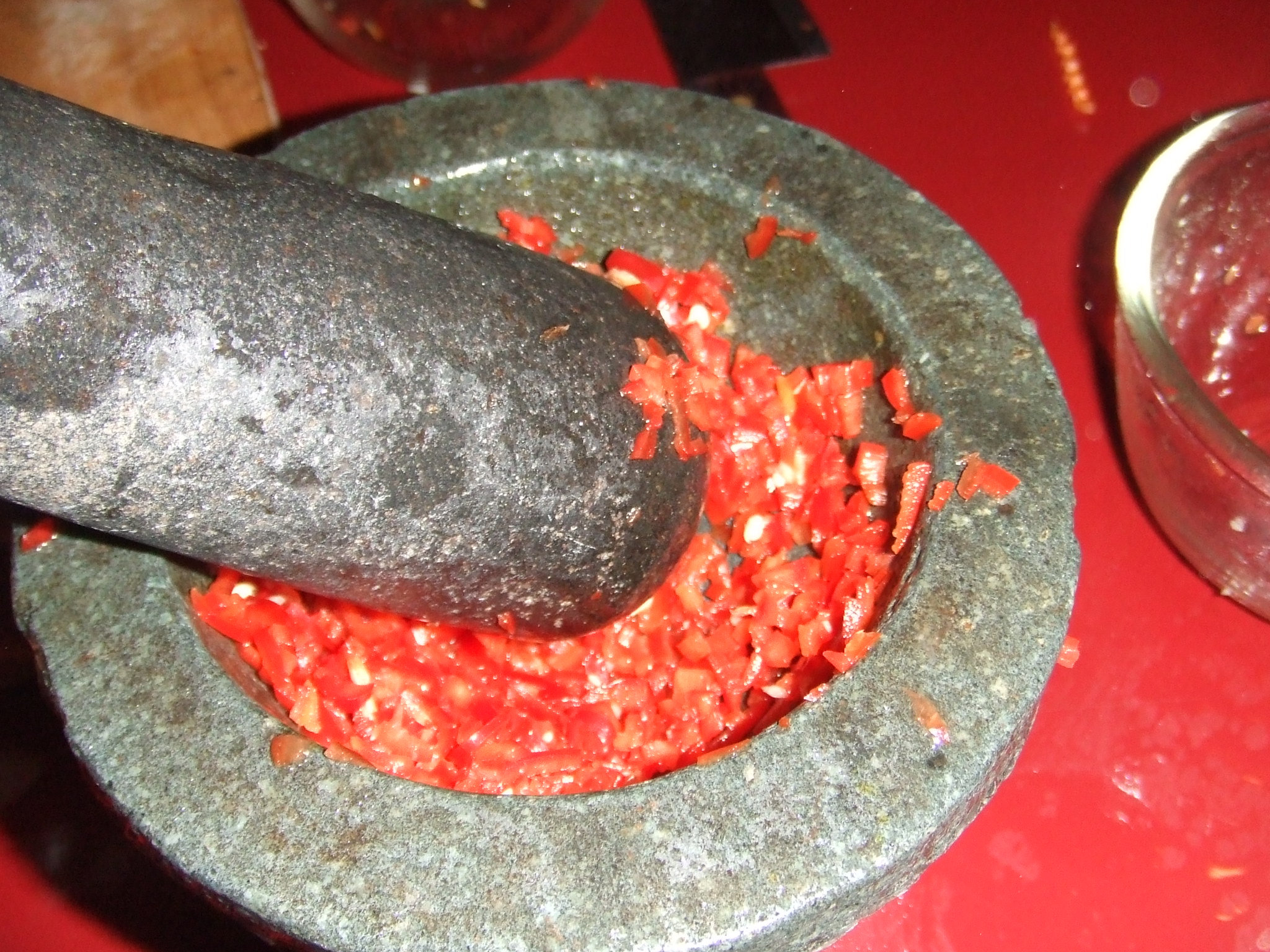 We used a mortar and pestle to pound the Fish Paste, Lime Juice and Chili Peppers