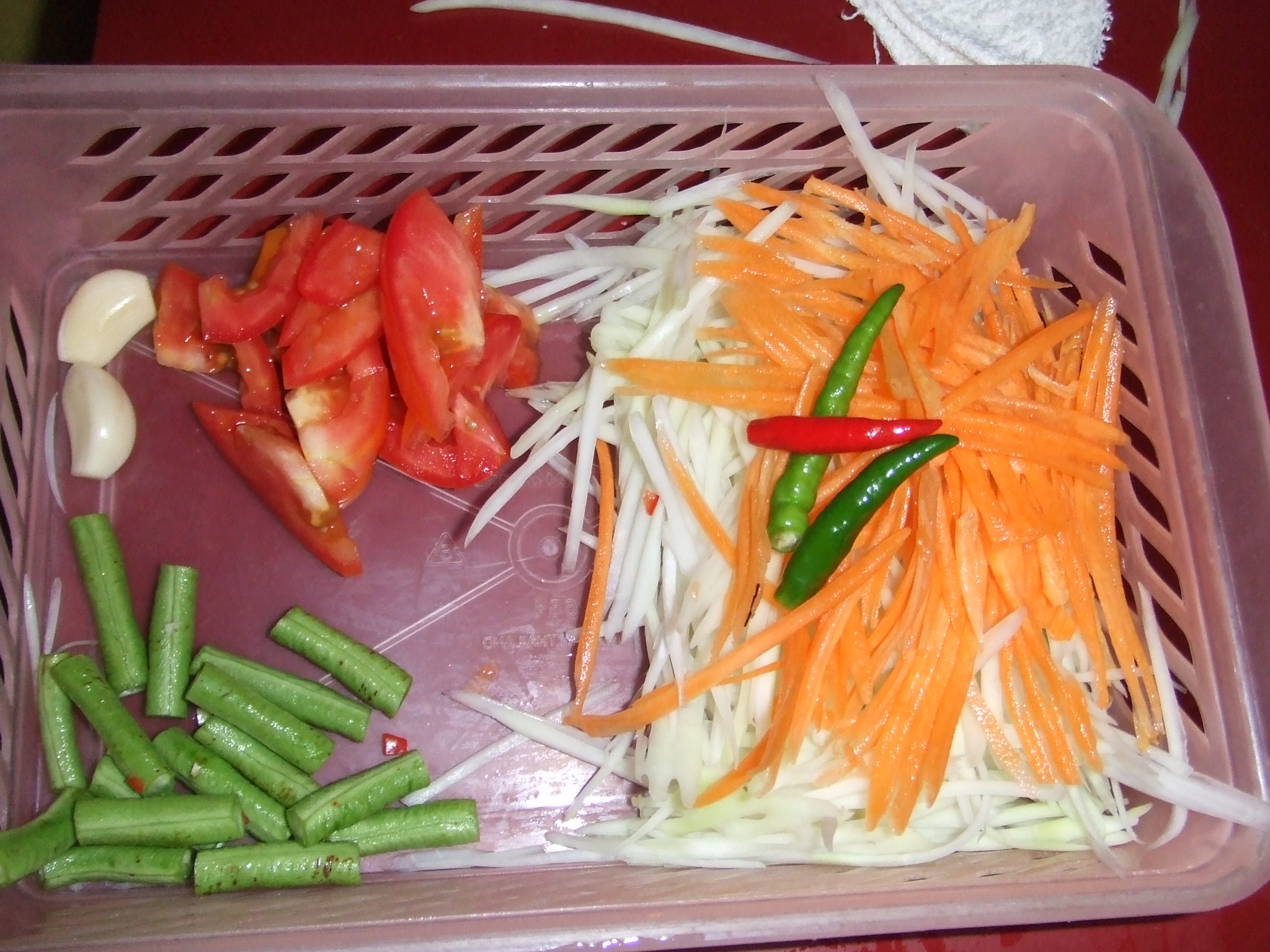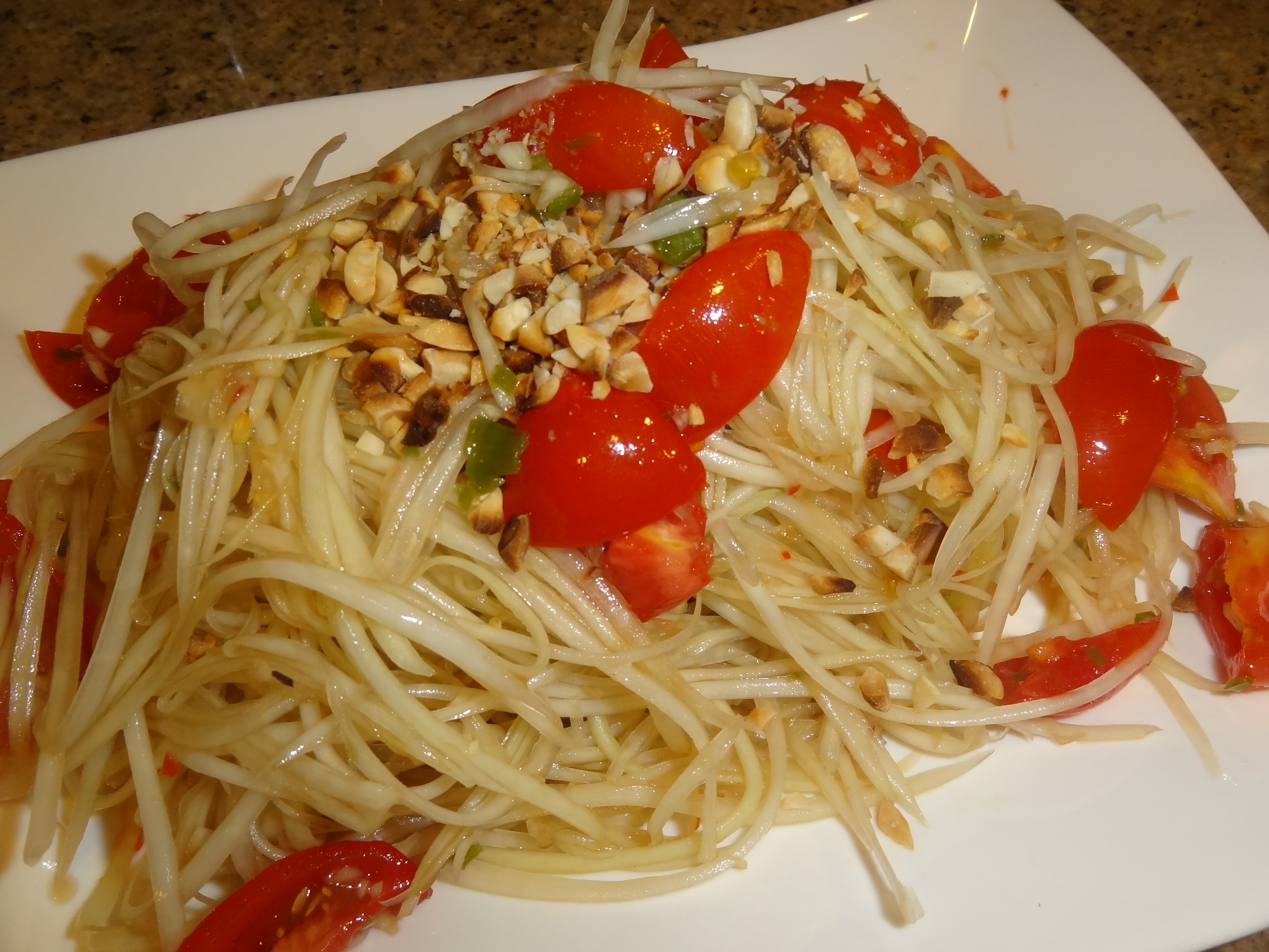 One of my absolute favorite Thai dishes. I always order Green Papaya Salad whenever I go to a Thai Restaurant. In 2011, I took a cooking class in Thailand. This was also on the menu for the day. All the vegetables were prepped for us so that made things a lot easier. I figured it REALLY is easy to make this. There are so many recipes out there so you certainly have to modify the amount of the ingredients to your liking but here is my recipe I used today.