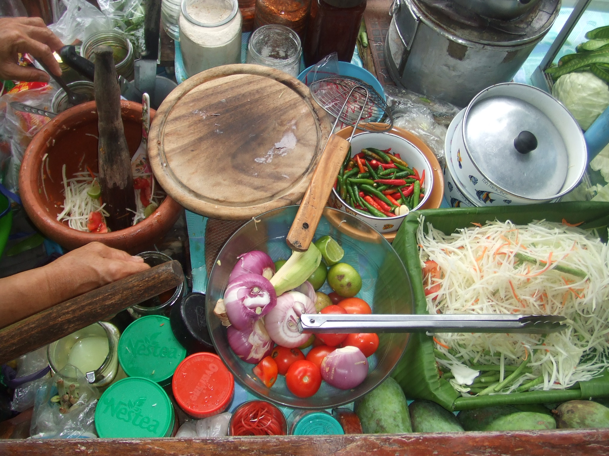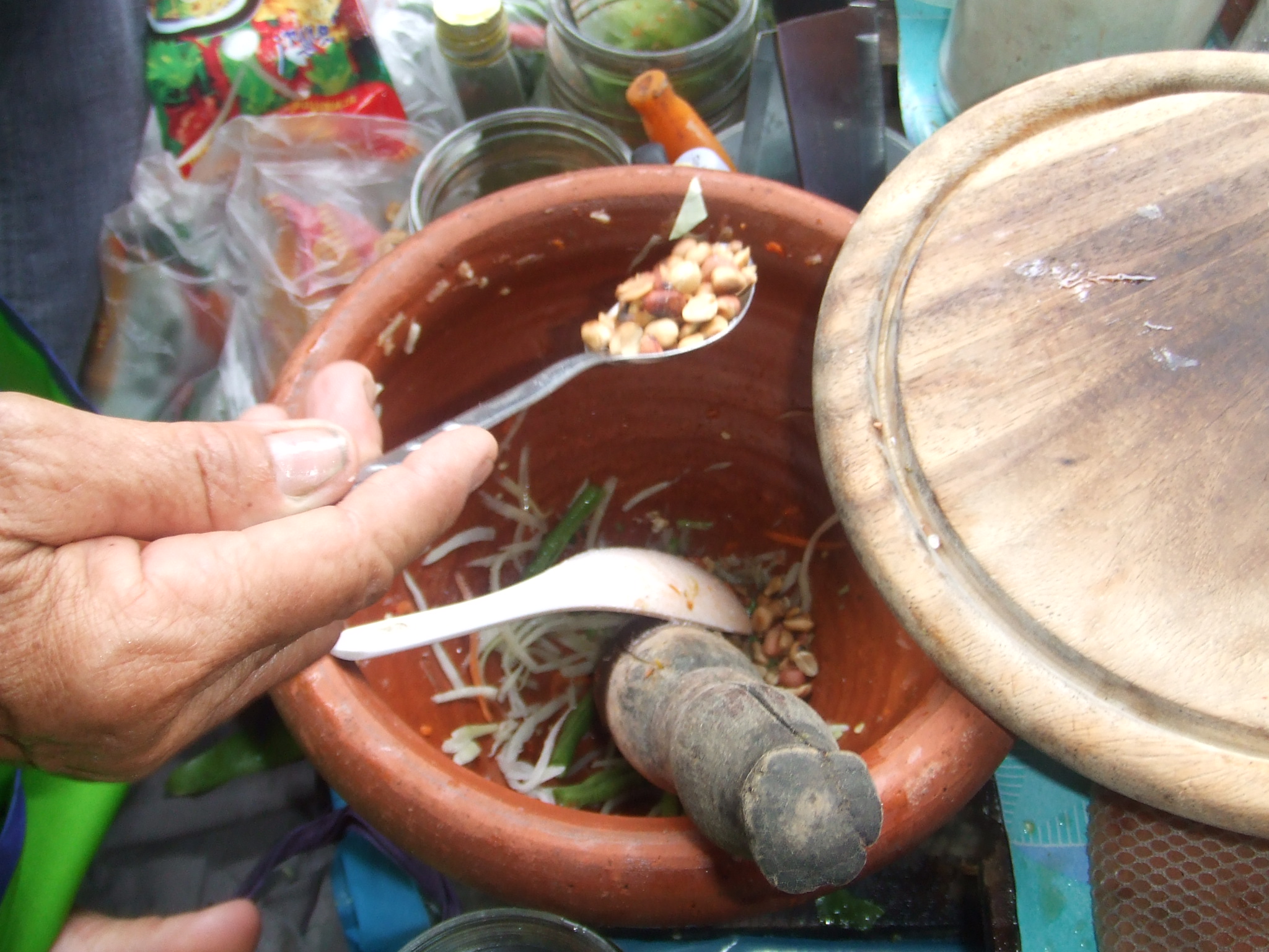 I also wanted to share the Green Papaya Salad we had at the Floating Market and how it was made. It doesn’t get more authentic than this. To be honest, I just had a couple bites because I was a bit apprehensive about eating the food at the Floating Market.