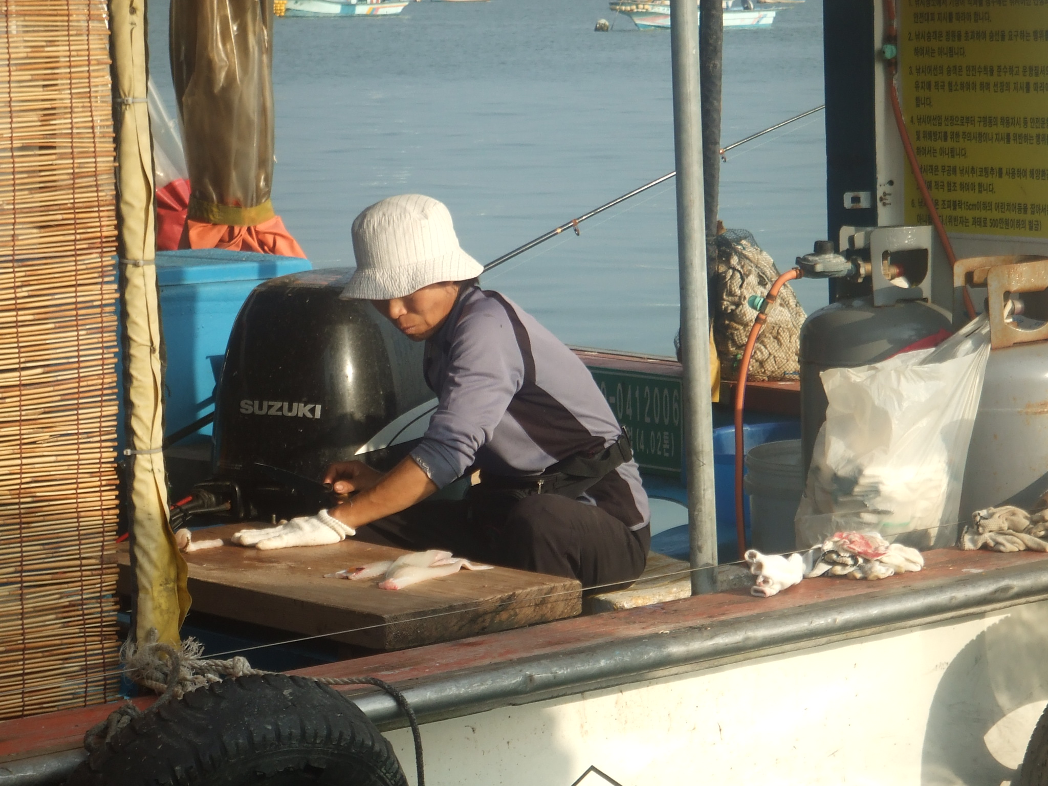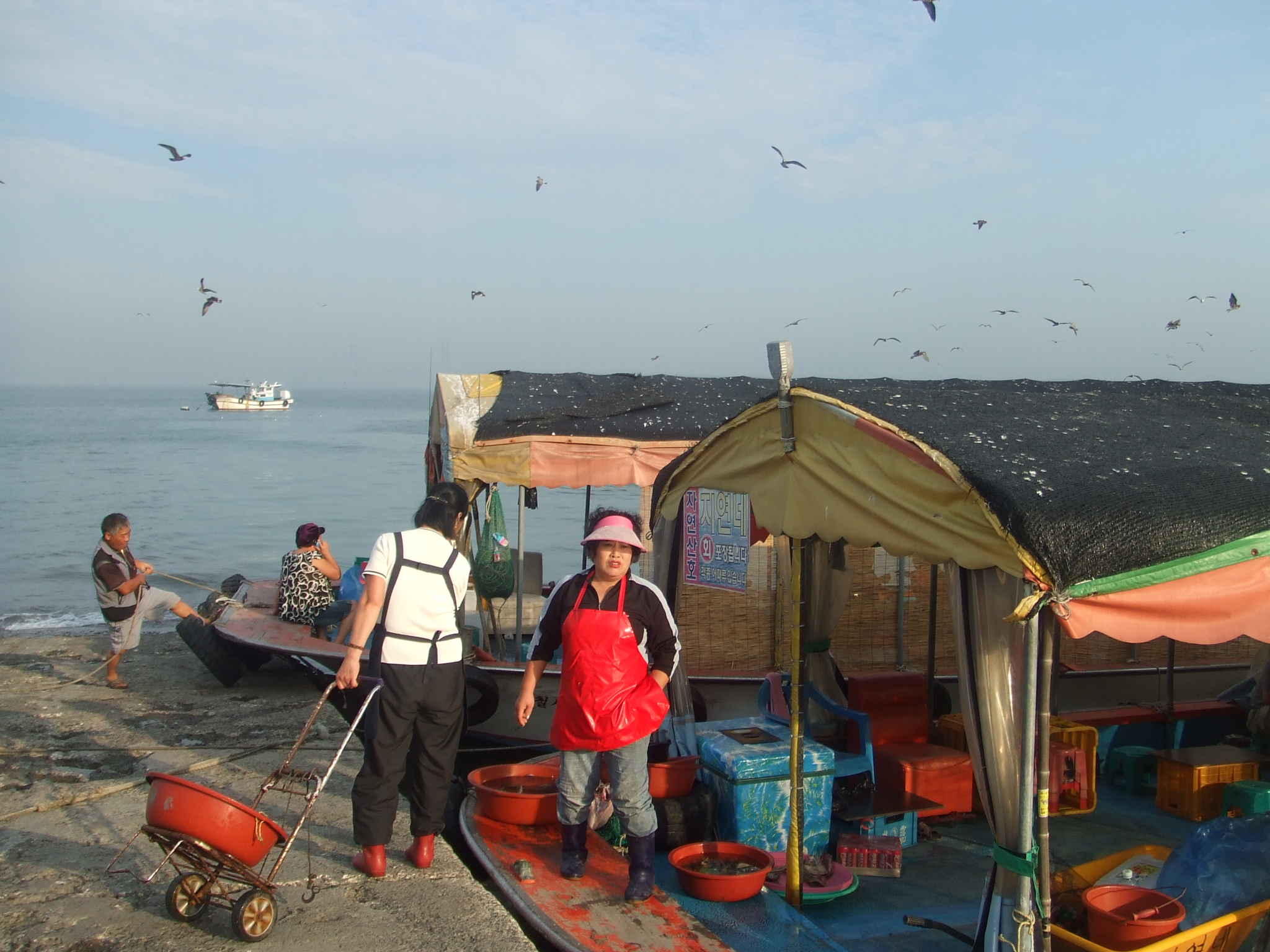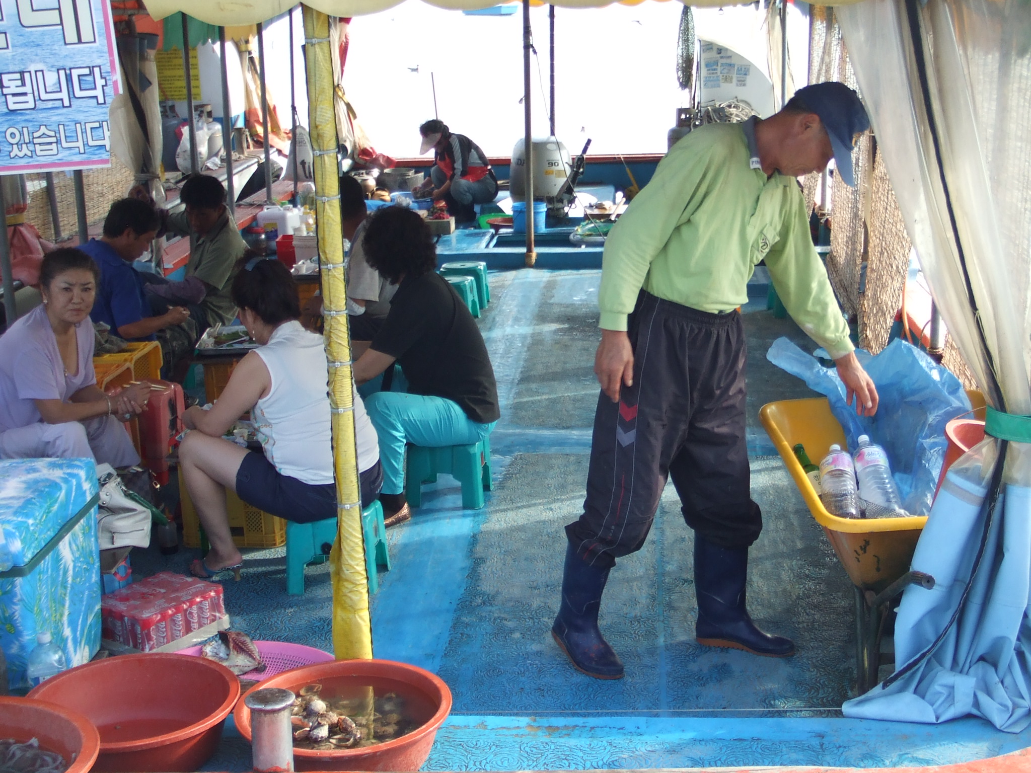 Ladies with heavy makeup are yelling in Korean to try to draw customers to their dock.