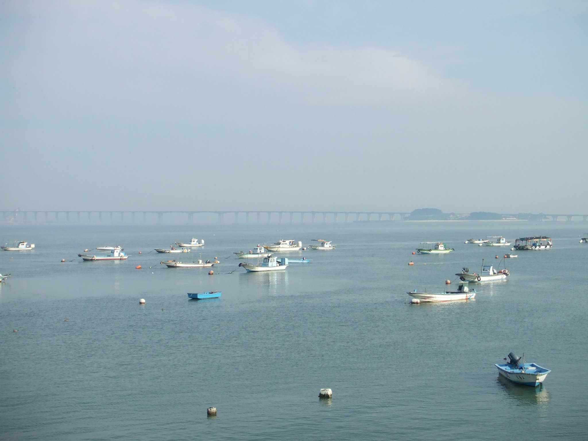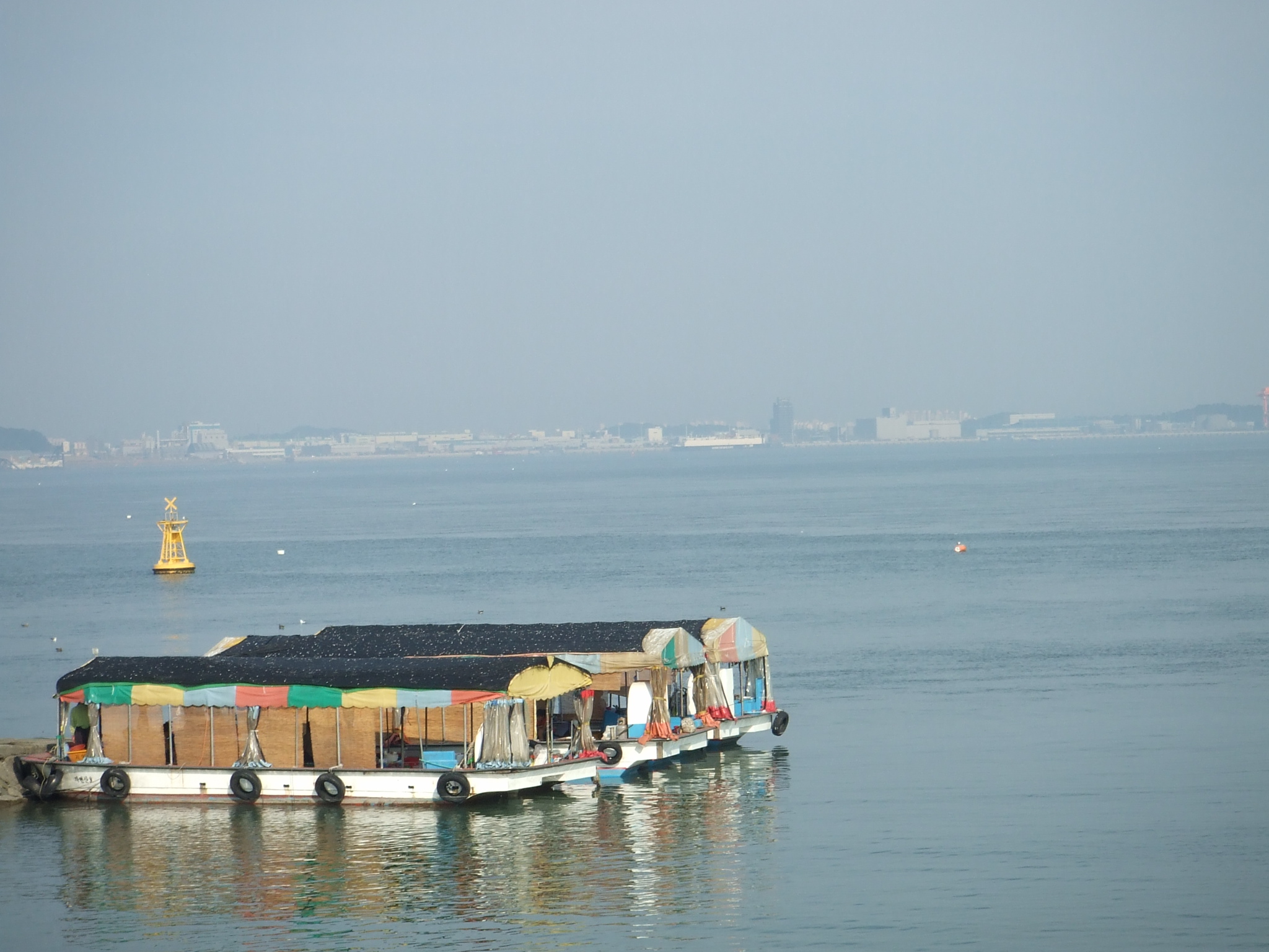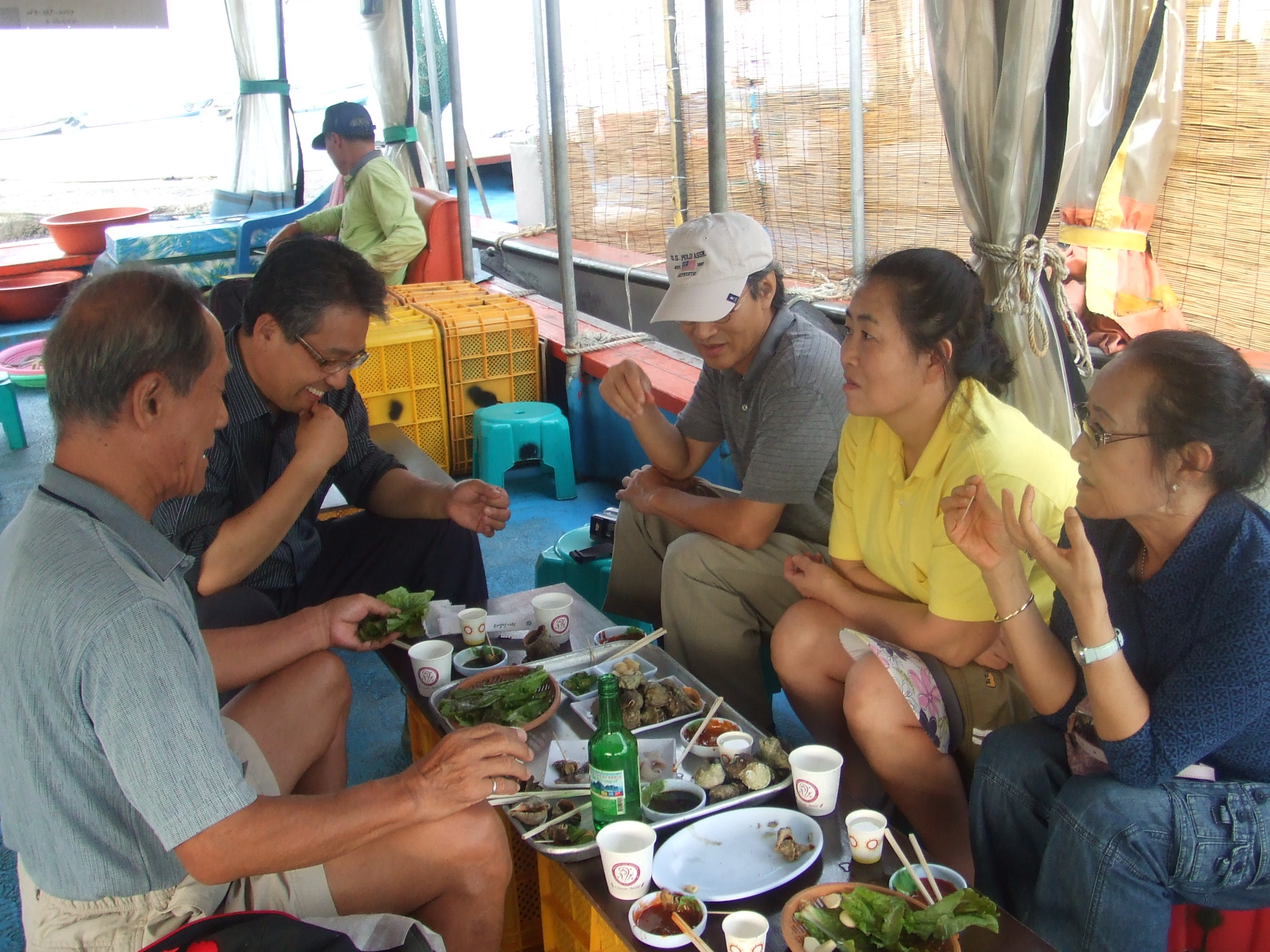 Ladies with heavy makeup are yelling in Korean to try to draw customers to their dock.