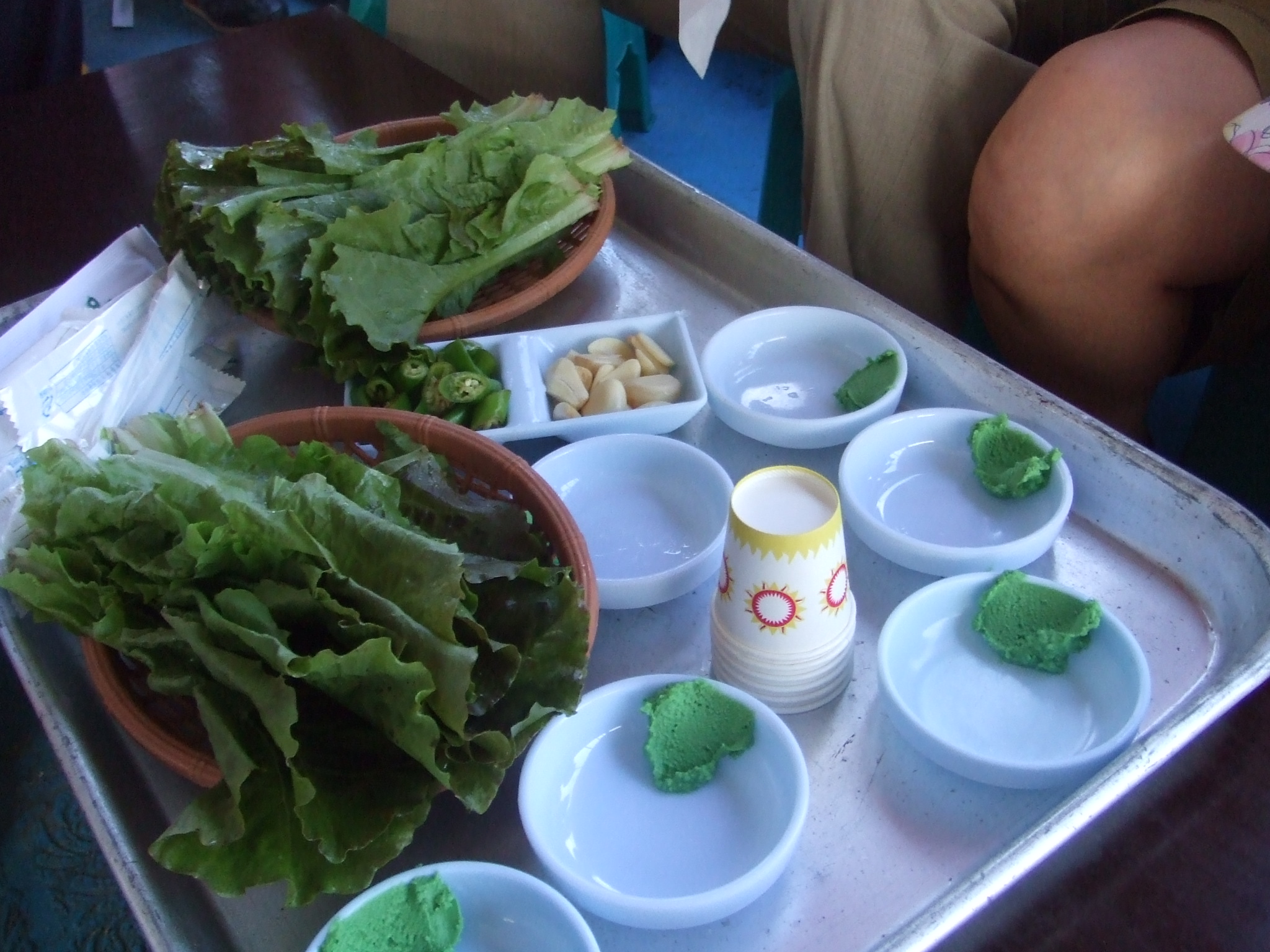 You are provided lettuce, fresh sliced chili pepper, garlic, waasabi and gojuchang sauce. (Korean Chili Pepper Paste/Sauce)