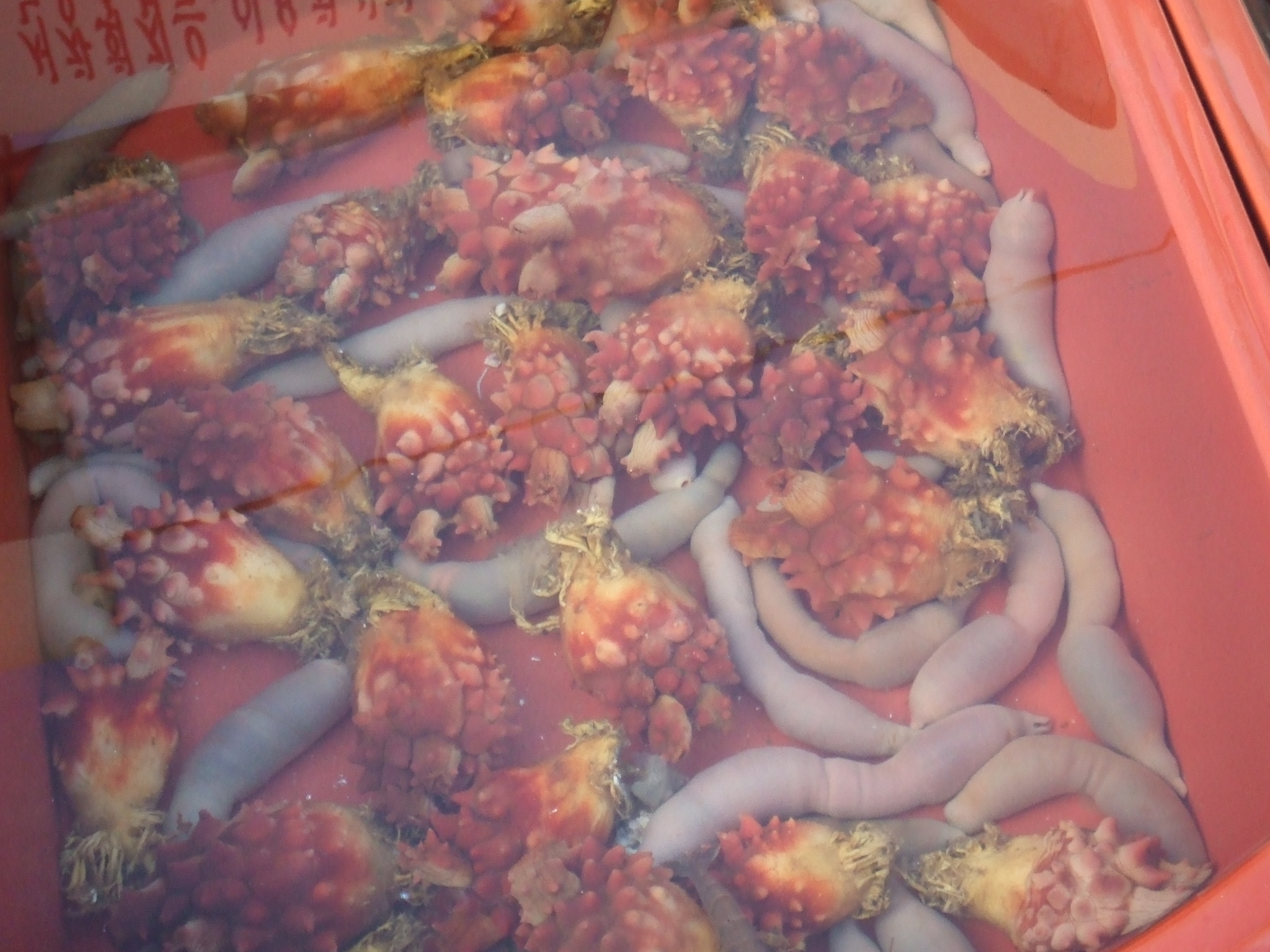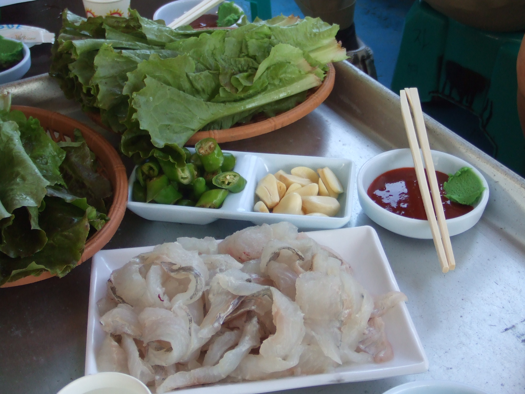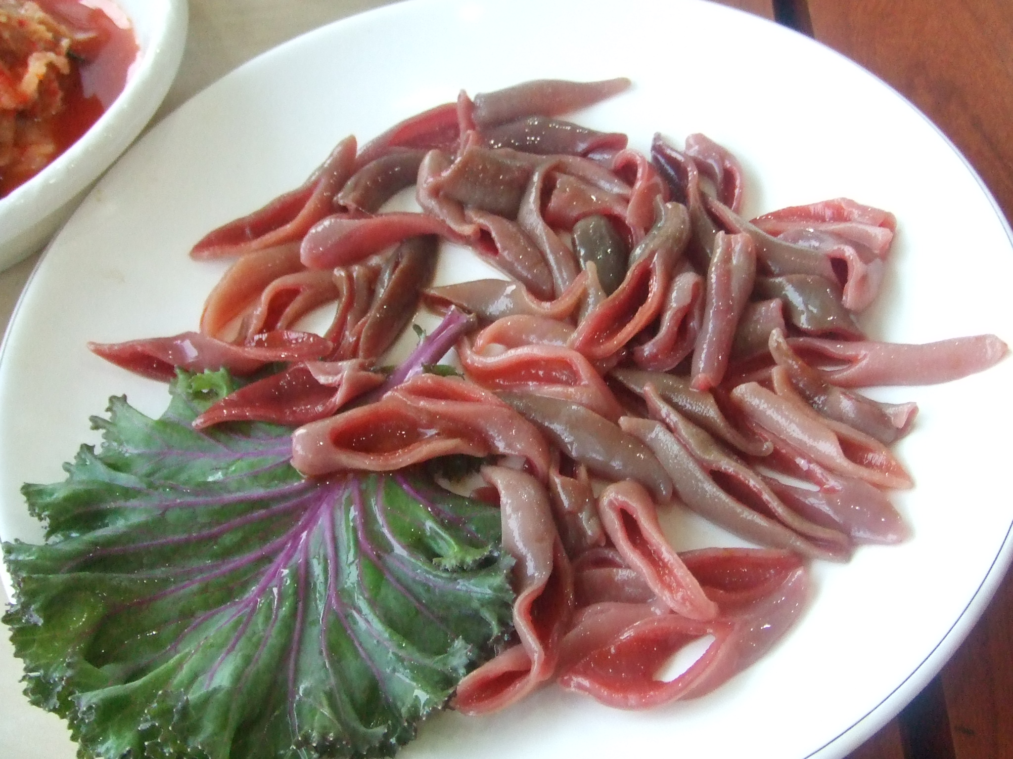 I won’t even mention what this looks like, but it is sliced up and dipped into Gojujang sauce (Korean Chili Pepper Paste/Sauce). Honestly, I had to PASS on this one.