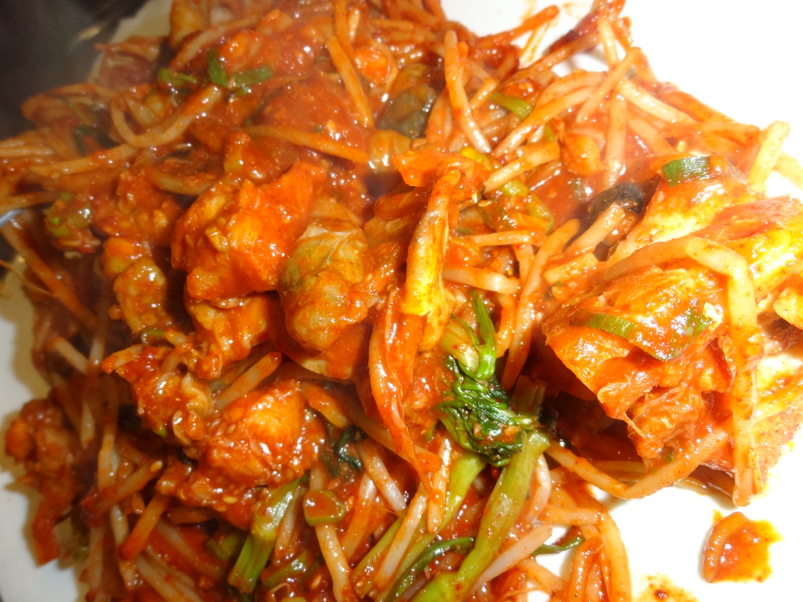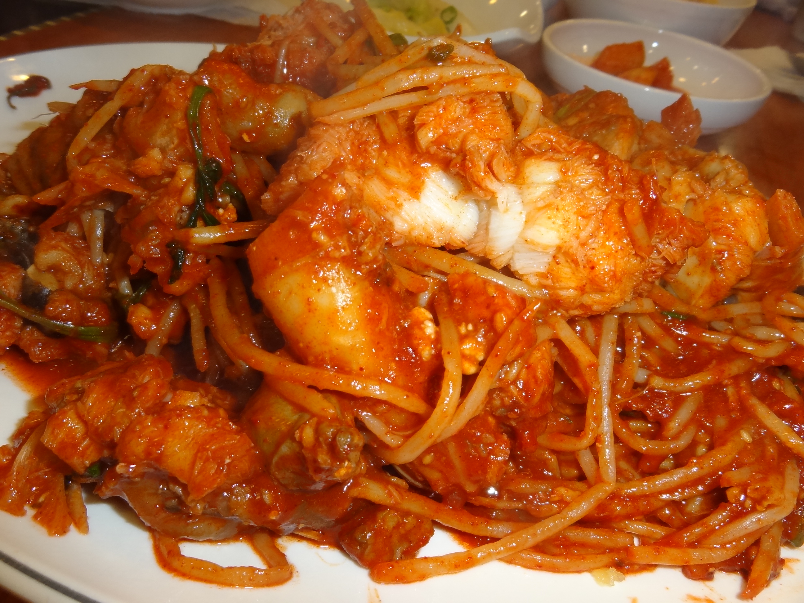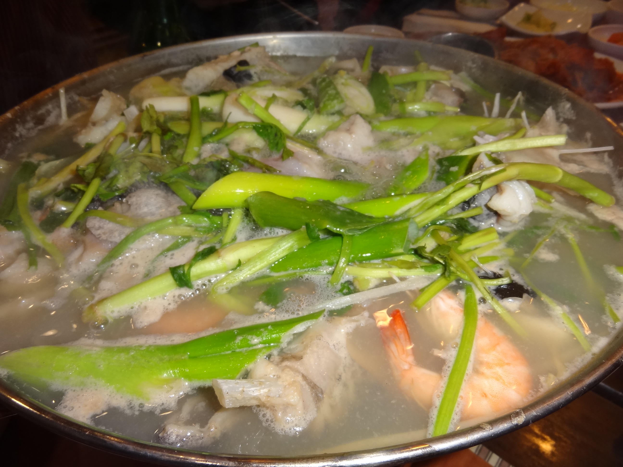 One of my favorite things about eating at Korean Restaurants is that they cook right at your table. The dishes are piping hot and fresh! Our first course was fish and seafood in a spicy Gojujang Sauce with bean sprouts and greens. SPICY but soooooooooooooo goooooood!