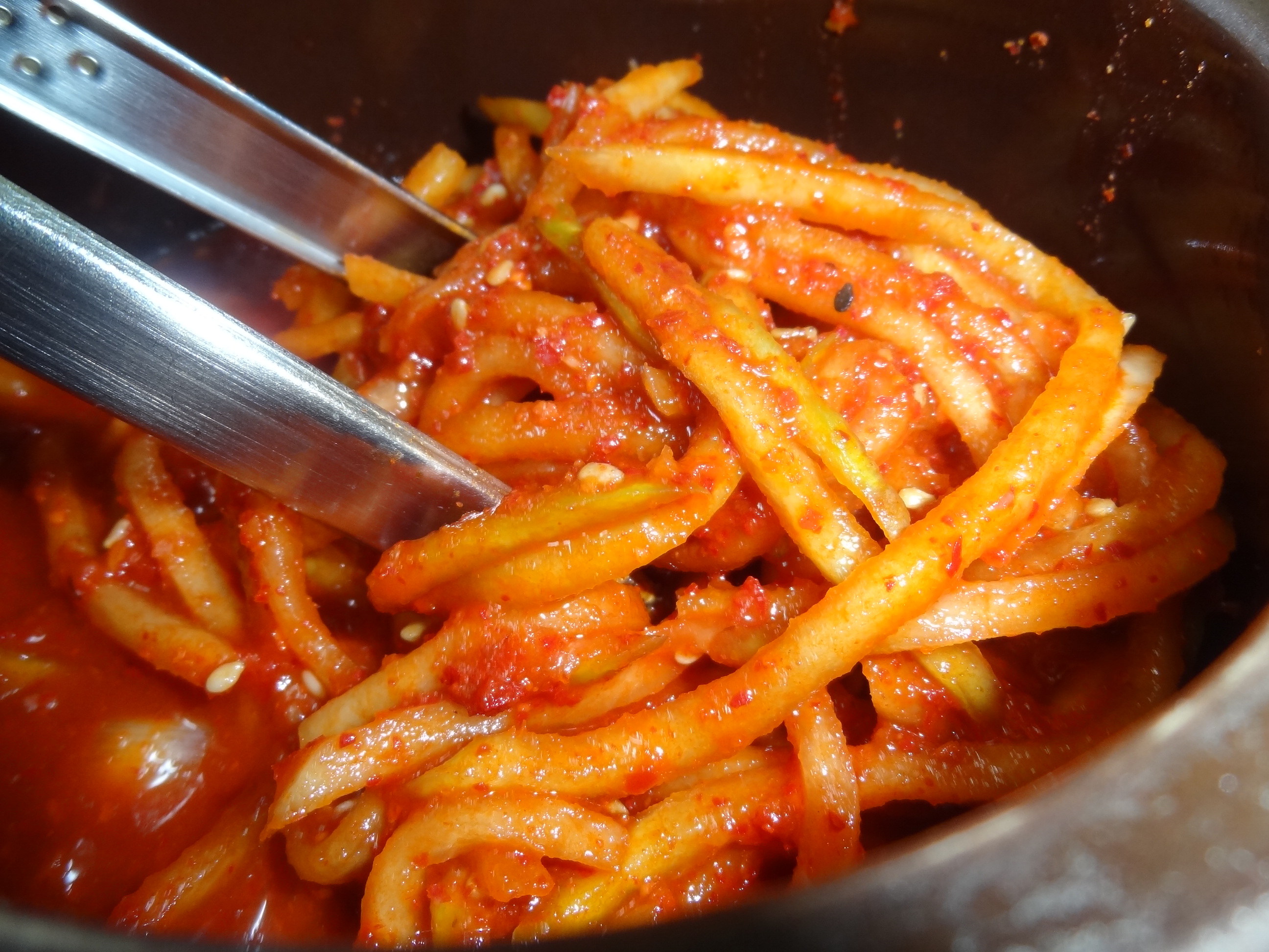 We got sat at a table where we had to sit on the floor and had big bowls of kimchee we could serve ourselves.