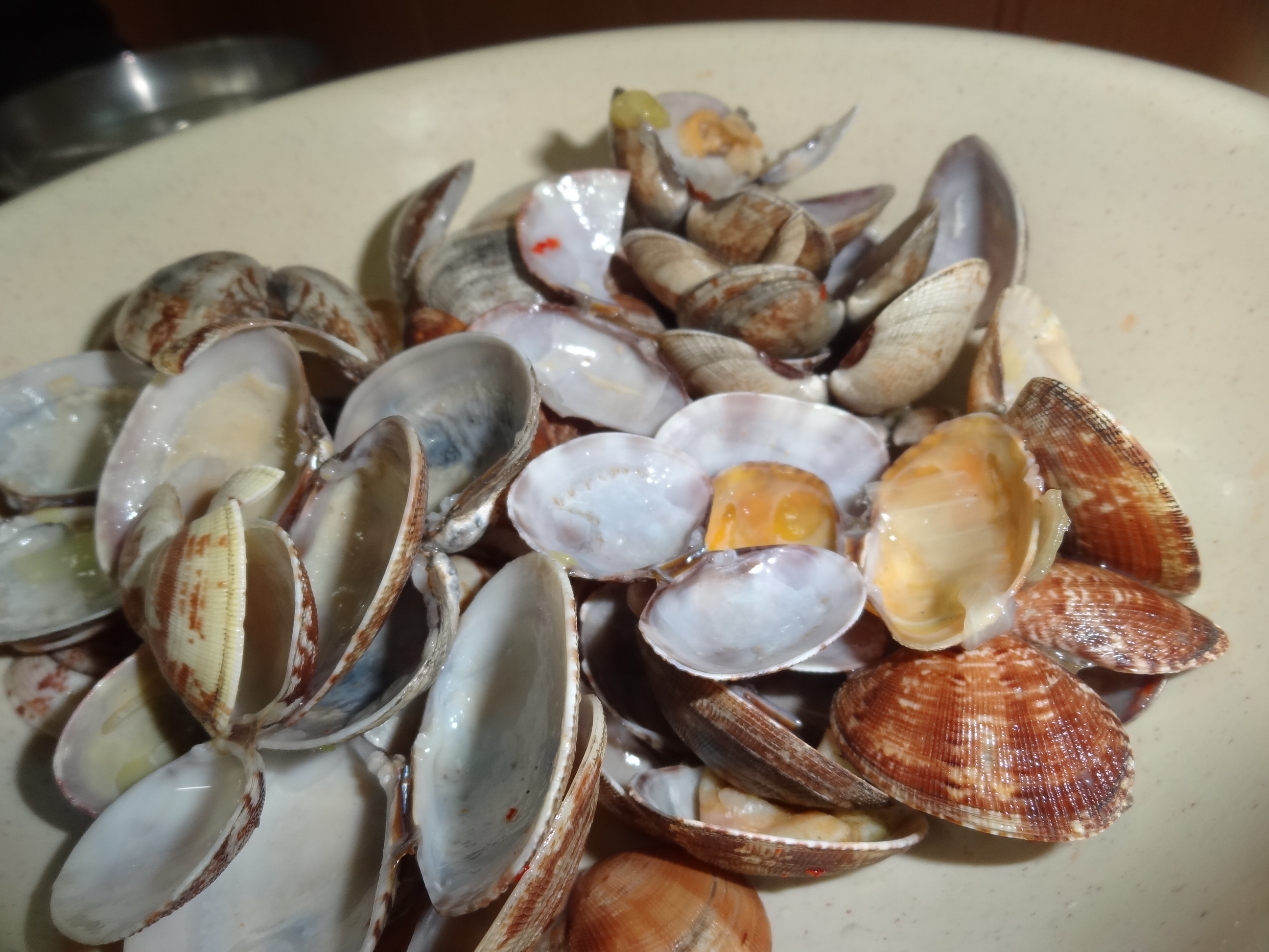 I WAS SO LUCK Y TO ENJOY THIS GIANT POT OF KAL GUK SOO, a Korean dish consisting of handmade, knife-cut wheat flour noodles served in a large bowl with broth and other ingredients. It is traditionally considered a seasonal food, consumed most often in summer. Its name comes from the fact that the noodles are CUT! This one I tried was a steaming pot of Clam broth, with Cut Noodles, Potatoes, Green Onion, Juicy Clams and Green Onion. MMMmmmmmmm GOODnessss!