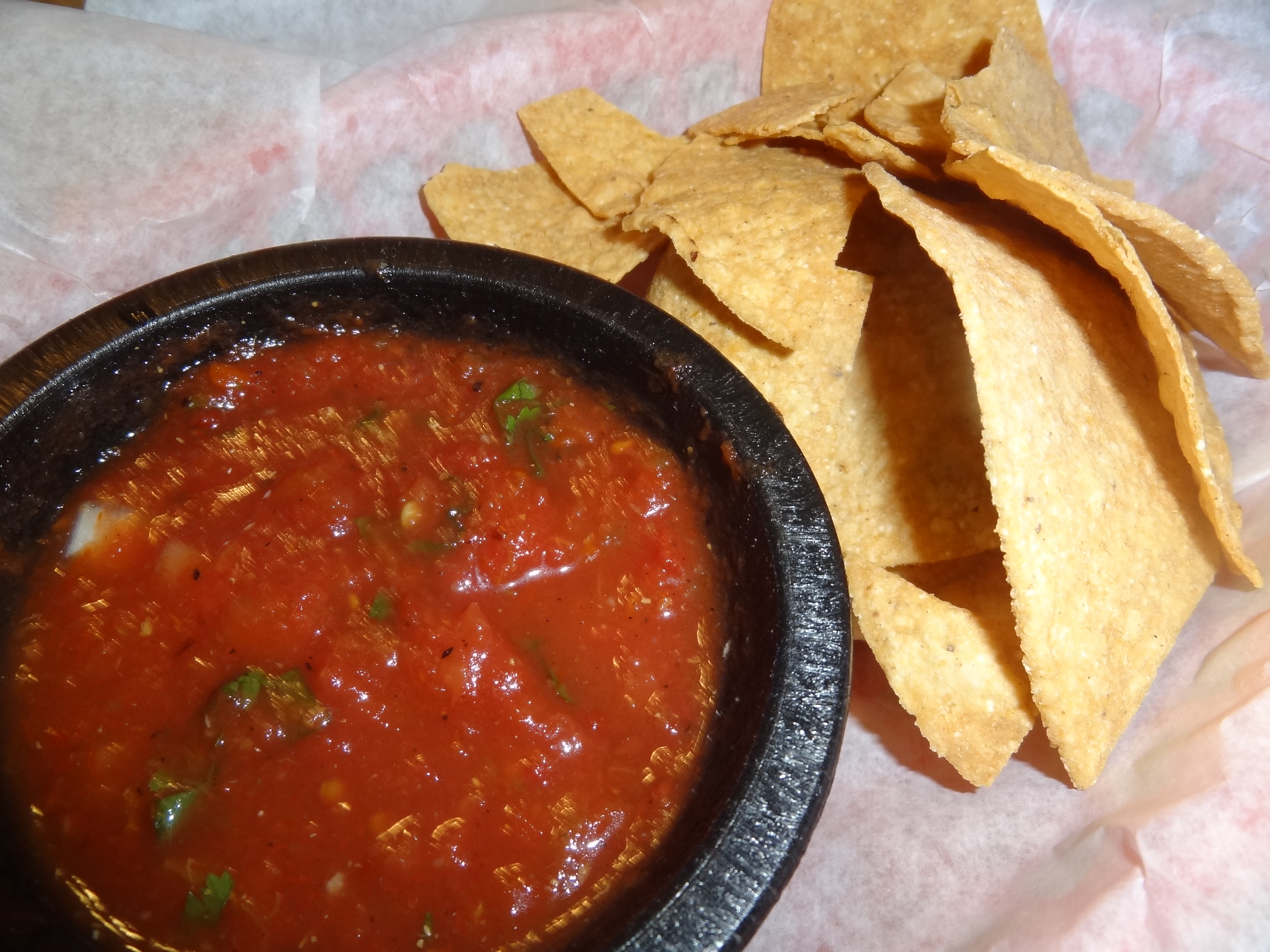 The atmostphere is lively and festive. Lots of tables and at lunch it’s not that crowded but I hear dinner is packed. We get served some chips and salsa. I love the chips. The salsa, I believe, is not made with fresh tomatoes, maybe canned tomatoes. It’s mild for me since I like mine with a kick!
